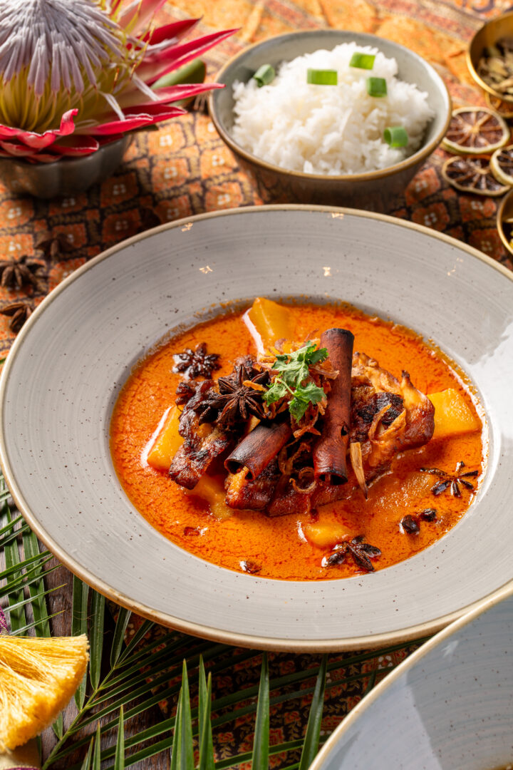 🥢 Gaeng Massaman Gai – delikatna pierś z kurczaka gotowana metodą sous-vide, grillowana i podawana w aromatycznym sosie curry z pastą massaman, mlekiem kokosowym i bulionem z krewetek.